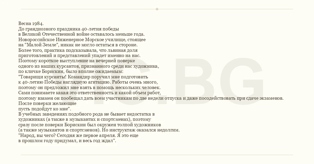 Весна 1984. До грандиозного праздника 40-летия победы в Великой Отечественной войне оставалось меньше года. Новороссийское Инженерное Морское училище, стоящее на "Малой Земле", никак не могло остаться в стороне. Более того, практика подсказывала, что львиная доля приготовлений и представлений упадет именно на нас. Поэтому короткое выступление на вечерней поверке одного из наших курсантов, признанного среди нас художника, по кличке Борискин, было вполне ожидаемым: "Товарищи курсанты! Командир поручил мне подготовить к 40-летию Победы наглядную агитацию. Работы очень много, поэтому он предложил мне взять в помощь нескольких человек. Сами понимаете какая это ответственность и какой объем работ, поэтому взамен он пообещал дать всем участникам по две недели отпуска и даже посодействовать при сдаче экзаменов. После поверки желающие пусть подойдут ко мне". В учебных заведениях подобного рода не бывает недостатка в художниках (а также в музыкантах и спортсменах), поэтому сразу после поверки Борискин был окружен толпой художников (а также музыкантов и спортсменов). Но инструктаж оказался недолгим. "Народ, вы чего? Сегодня же первое апреля. Я это еще в прошлом году придумал, и весь год ждал".