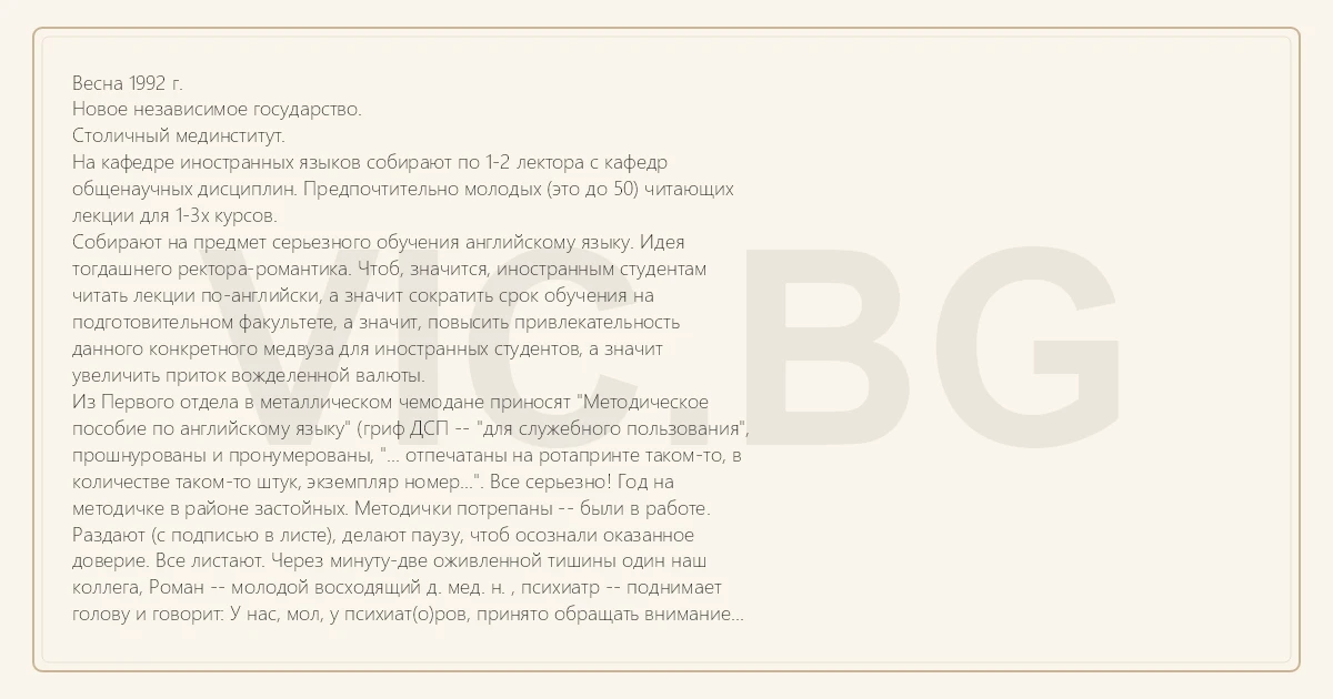 Весна 1992 г. Новое независимое государство. Столичный мединститут. На кафедре иностранных языков собирают по 1-2 лектора с кафедр общенаучных дисциплин. Предпочтительно молодых (это до 50) читающих лекции для 1-3х курсов. Собирают на предмет серьезного обучения английскому языку. Идея тогдашнего ректора-романтика. Чтоб, значится, иностранным студентам читать лекции по-английски, а значит сократить срок обучения на подготовительном факультете, а значит, повысить привлекательность данного конкретного медвуза для иностранных студентов, а значит увеличить приток вожделенной валюты. Из Первого отдела в металлическом чемодане приносят "Методическое пособие по английскому языку" (гриф ДСП -- "для служебного пользования", прошнурованы и пронумерованы, "... отпечатаны на ротапринте таком-то, в количестве таком-то штук, экземпляр номер...". Все серьезно! Год на методичке в районе застойных. Методички потрепаны -- были в работе. Раздают (с подписью в листе), делают паузу, чтоб осознали оказанное доверие. Все листают. Через минуту-две оживленной тишины один наш коллега, Роман -- молодой восходящий д. мед. н. , психиатр -- поднимает голову и говорит: У нас, мол, у психиат(о)ров, принято обращать внимание на мелочи. Вот, к примеру, опечатки могут многое сказать о состоянии духа и личном отношении к предмету у человека, печатавшего документ. Я, собственно, предлагаю посмотреть Введение... Читаем: "Настоящее методическое пособие предназначено для обучения языку врачей-интернов и специалистов выезжающих для работы в _НАГЛО_язычные страны." (выделено мною Д.) Бедная-бедная выпускница иняза... Она, не жалея младых ногтей, печатала эти методички, а кто-то нагло ездил за границу, да еще там на иностранном языке разговаривал! А методички использовались лет пятнадцать до того. Никто не прочитал введения?