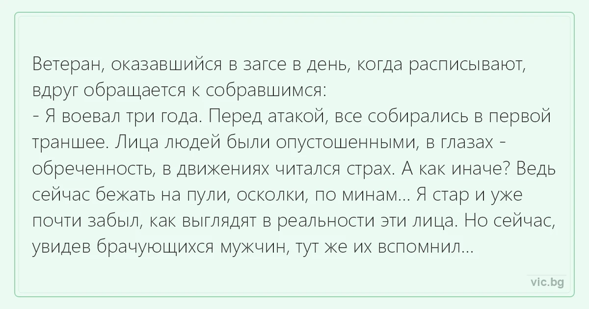 Ветеран, оказавшийся в загсе в день, когда расписывают, вдруг обращается к собравшимся:
