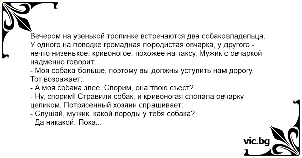 - Ну, спорим! Стравили собак, и кривоногая слопала овчарку целиком. Потрясенный хозяин спрашивает: