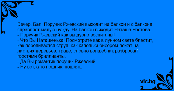 Вечер. Бал. Поручик Ржевский выходит на балкон и с балкона справляет малую нужду. На балкон выходит Наташа Ростова.