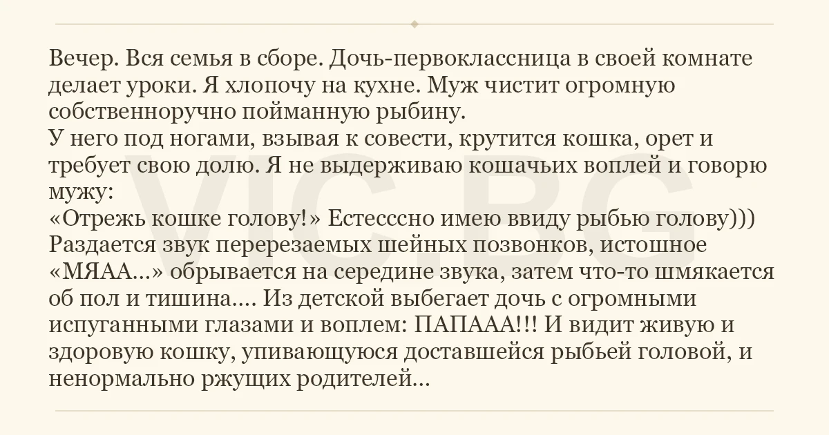 Вечер. Вся семья в сборе. Дочь-первоклассница в своей комнате делает уроки. Я хлопочу на кухне. Муж чистит огромную собственноручно пойманную рыбину. У него под ногами, взывая к совести, крутится кошка, орет и требует свою долю. Я не выдерживаю кошачьих воплей и говорю мужу: «Отрежь кошке голову!» Естесссно имею ввиду рыбью голову))) Раздается звук перерезаемых шейных позвонков, истошное «МЯАА…» обрывается на середине звука, затем что-то шмякается об пол и тишина…. Из детской выбегает дочь с огромными испуганными глазами и воплем: ПАПААА!!! И видит живую и здоровую кошку, упивающуюся доставшейся рыбьей головой, и ненормально ржущих родителей…