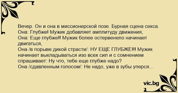 Она: Еще глубже!! Мужик более остервенело начинает двигаться,