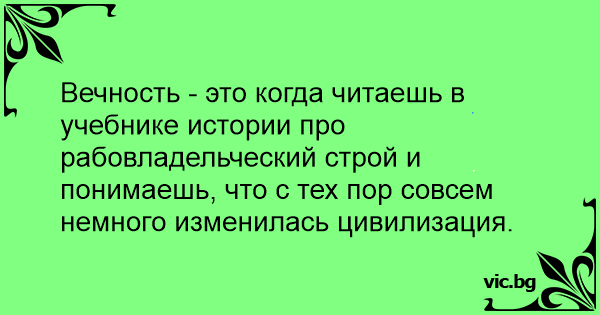 Вечность - это когда читаешь в учебнике истории про рабовладельческий строй и понимаешь, что с тех пор совсем немного изменилась цивилизация.