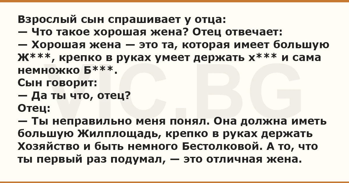 Взрослый сын спрашивает у отца: — Что такое хорошая жена? Отец отвечает: — Хорошая жена — это та, которая имеет большую Ж***, крепко в руках умеет держать х*** и сама немножко Б***. Сын говорит: — Да ты что, отец? Отец: — Ты неправильно меня понял. Она должна иметь большую Жилплощадь, крепко в руках держать Хозяйство и быть немного Бестолковой. А то, что ты первый раз подумал, — это отличная жена.