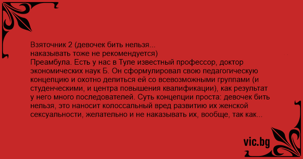 Преамбула. Есть у нас в Туле известный профессор, доктор экономических наук Б. Он сформулировал свою педагогическую концепцию и охотно делиться ей со всевозможными группами (и студенческими, и центра повышения квалификации), как результат у него много последователей. Суть концепции проста: девочек бить нельзя, это наносит колоссальный вред развитию их женской сексуальности, желательно и не наказывать их, вообще, так как наказание сильно деформирует детскую психику. На мальчиков такие льготы не распространяются.