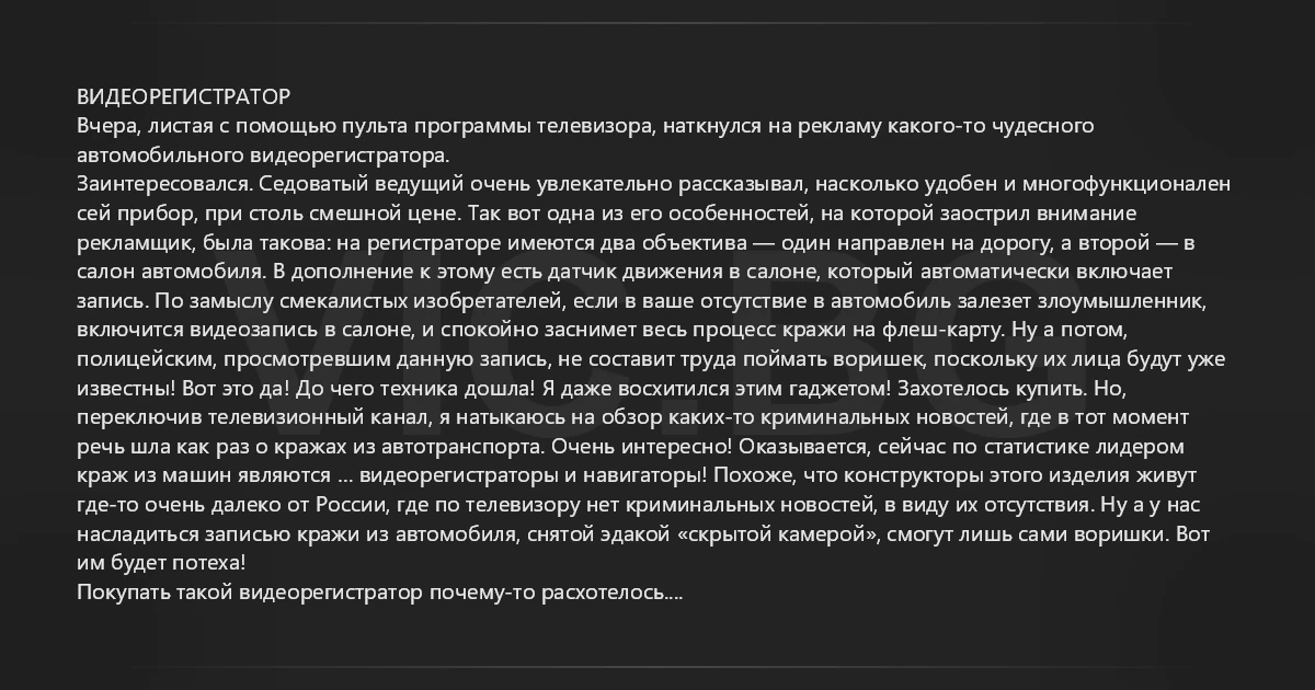 ВИДЕОРЕГИСТРАТОР Вчера, листая с помощью пульта программы телевизора, наткнулся на рекламу какого-то чудесного автомобильного видеорегистратора. Заинтересовался. Седоватый ведущий очень увлекательно рассказывал, насколько удобен и многофункционален сей прибор, при столь смешной цене. Так вот одна из его особенностей, на которой заострил внимание рекламщик, была такова: на регистраторе имеются два объектива — один направлен на дорогу, а второй — в салон автомобиля. В дополнение к этому есть датчик движения в салоне, который автоматически включает запись. По замыслу смекалистых изобретателей, если в ваше отсутствие в автомобиль залезет злоумышленник, включится видеозапись в салоне, и спокойно заснимет весь процесс кражи на флеш-карту. Ну а потом, полицейским, просмотревшим данную запись, не составит труда поймать воришек, поскольку их лица будут уже известны! Вот это да! До чего техника дошла! Я даже восхитился этим гаджетом! Захотелось купить. Но, переключив телевизионный канал, я натыкаюсь на обзор каких-то криминальных новостей, где в тот момент речь шла как раз о кражах из автотранспорта. Очень интересно! Оказывается, сейчас по статистике лидером краж из машин являются … видеорегистраторы и навигаторы! Похоже, что конструкторы этого изделия живут где-то очень далеко от России, где по телевизору нет криминальных новостей, в виду их отсутствия. Ну а у нас насладиться записью кражи из автомобиля, снятой эдакой «скрытой камерой», смогут лишь сами воришки. Вот им будет потеха! Покупать такой видеорегистратор почему-то расхотелось....