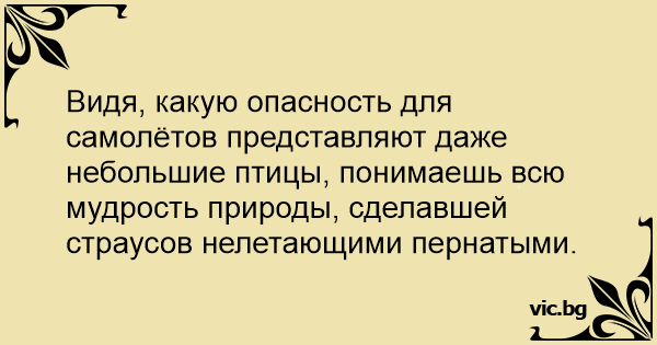 Видя, какую опасность для самолётов представляют даже небольшие птицы, понимаешь всю мудрость природы, сделавшей страусов нелетающими пернатыми.