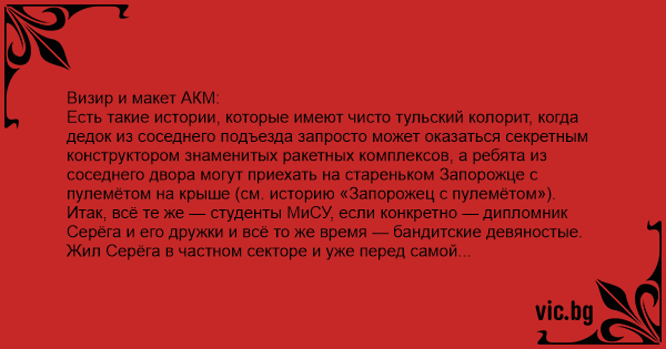 Визир и макет АКМ: Есть такие истории, которые имеют чисто тульский колорит, когда дедок из соседнего подъезда запросто может оказаться секретным конструктором знаменитых ракетных комплексов, а ребята из соседнего двора могут приехать на стареньком Запорожце с пулемётом на крыше (см. историю «Запорожец с пулемётом»). Итак, всё те же — студенты МиСУ, если конкретно — дипломник Серёга и его дружки и всё то же время — бандитские девяностые. Жил Серёга в частном секторе и уже перед самой защитой притащил показать друганам свою разработку — визир к АКМ-74. Суть простая — на автомат крепится видиокамера, а перед глазом солдата видеоокуляр. Под любым огнём противника можно высунуть дуло автомата из-за укрытия и произвести прицельный выстрел, не рискуя получить пулю в лоб. Принёс он визир естественно с деревянным макетом АКМ — чёрным и очень натуральным. Раз пригласил друзей — надо бежать в магазин для организации приёма гостей. А раз во дворе секретная военная разработка — надо закрыть калитку на ключ, благо забор глухой и что происходит во дворе с улицы не видно. На его беду друзья включили колонки по полной, а сосед, и так уставший от Серёгиной громкой музыки, явился нецензурно качать права и очень громко постучал по калитке снаружи чем-то тяжёлым, потребовав открыть. Серёгины же друзья среагировали на мат с улицы мягко говоря неадекватно: не имея физической возможности (ключа) отпереть калитку они решили высунуть на улицу, сверху от калитки, визир, чтобы посмотреть, кто там мешает им культурно слушать музон. Макет АКМ они от визира, естественно, не открутили. Не успели наверное. Вот вам смешно... А Серёга потом неделю чинил соседский забор, снесенный спасающимся от отстрела мамонтом!