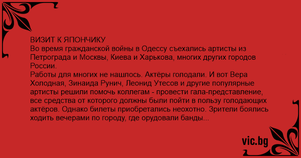 Во время гражданской войны в Одессу съехались артисты из Петрограда и Москвы, Киева и Харькова, многих других городов России. Работы для многих не нашлось. Актёры голодали. И вот Вера Холодная, Зинаида Рунич, Леонид Утесов и другие популярные артисты решили помочь коллегам - провести гала-представление, все средства от которого должны были пойти в пользу голодающих актёров. Однако билеты приобретались неохотно. Зрители боялись ходить вечерами по городу, где орудовали банды Япончика. Чтобы концерт мог состояться, Утесов пошёл на встречу к Япончику в кафе "Фанкони" и попросил его в этот вечер "никого не трогать". Король одесских воров согласился. На одесских афишных тумбах расклеивали афиши со странной припиской: "Свободный ход по городу до 6 утра". Одесситы текст поняли. Театр был полон.