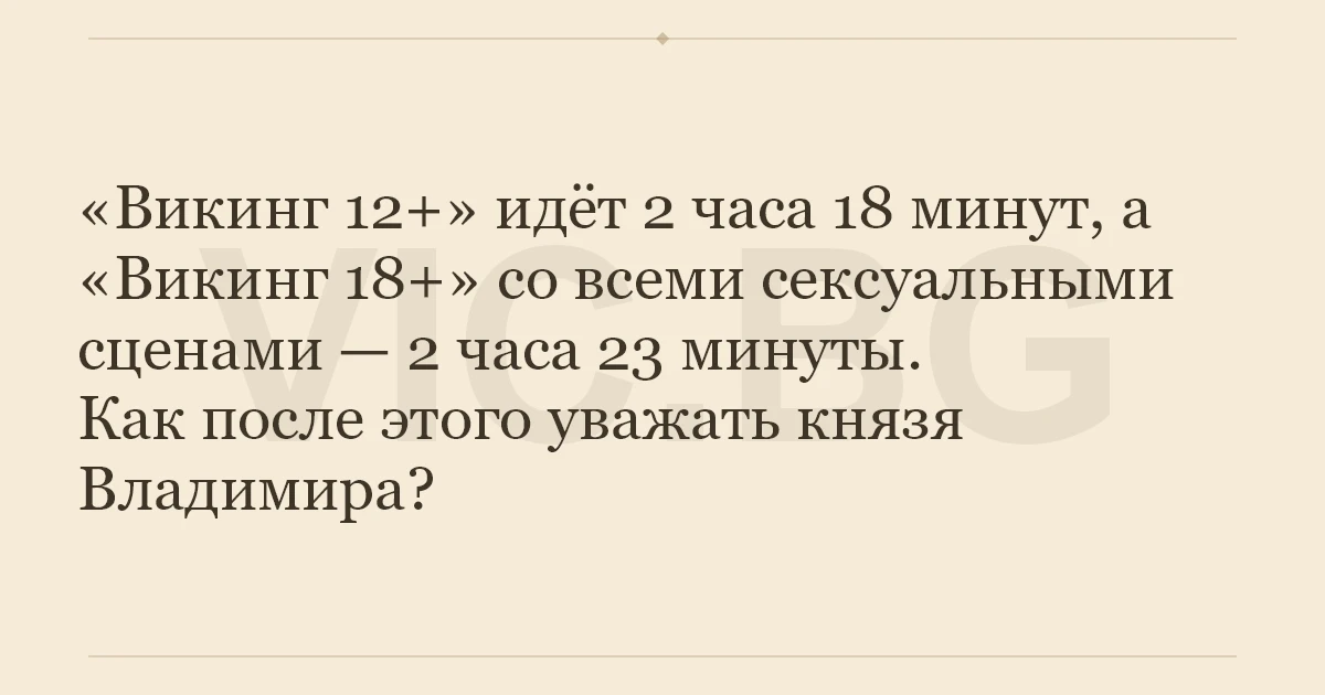 «Викинг 12+» идёт 2 часа 18 минут, а «Викинг 18+» со всеми сексуальными сценами — 2 часа 23 минуты. Как после этого уважать князя Владимира?