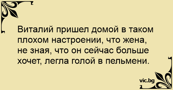 Виталий пришел домой в таком плохом настроении, что жена, не зная, что он сейчас больше хочет, легла голой в пельмени.