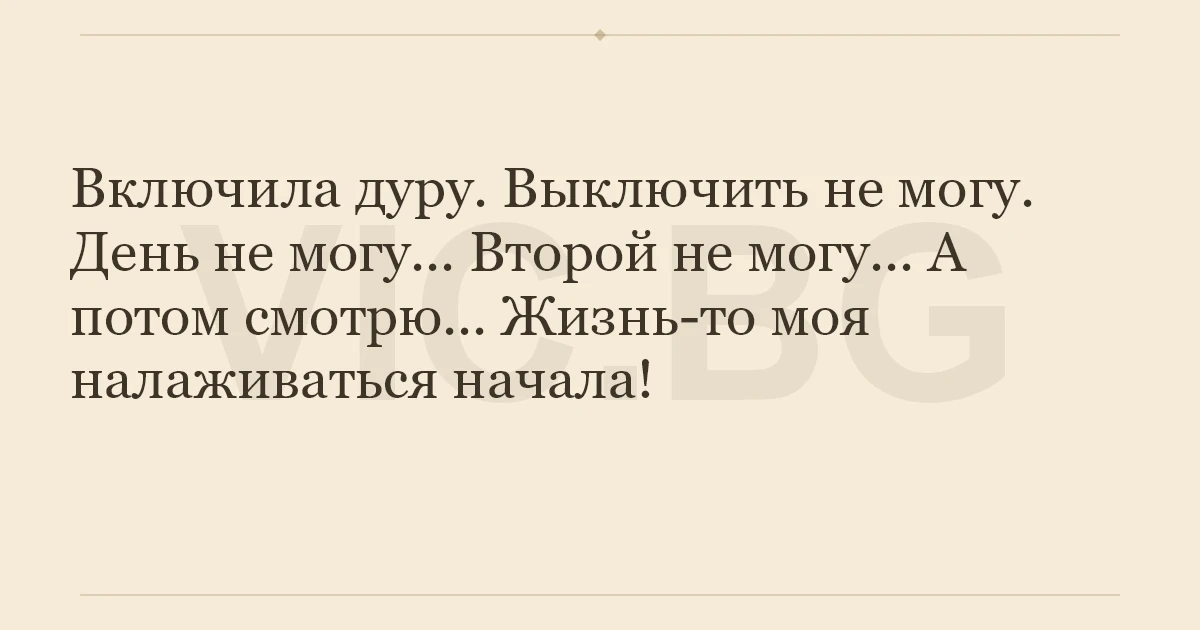 Включила дуру. Выключить не могу. День не могу... Второй не могу... А потом смотрю... Жизнь-то моя налаживаться начала!