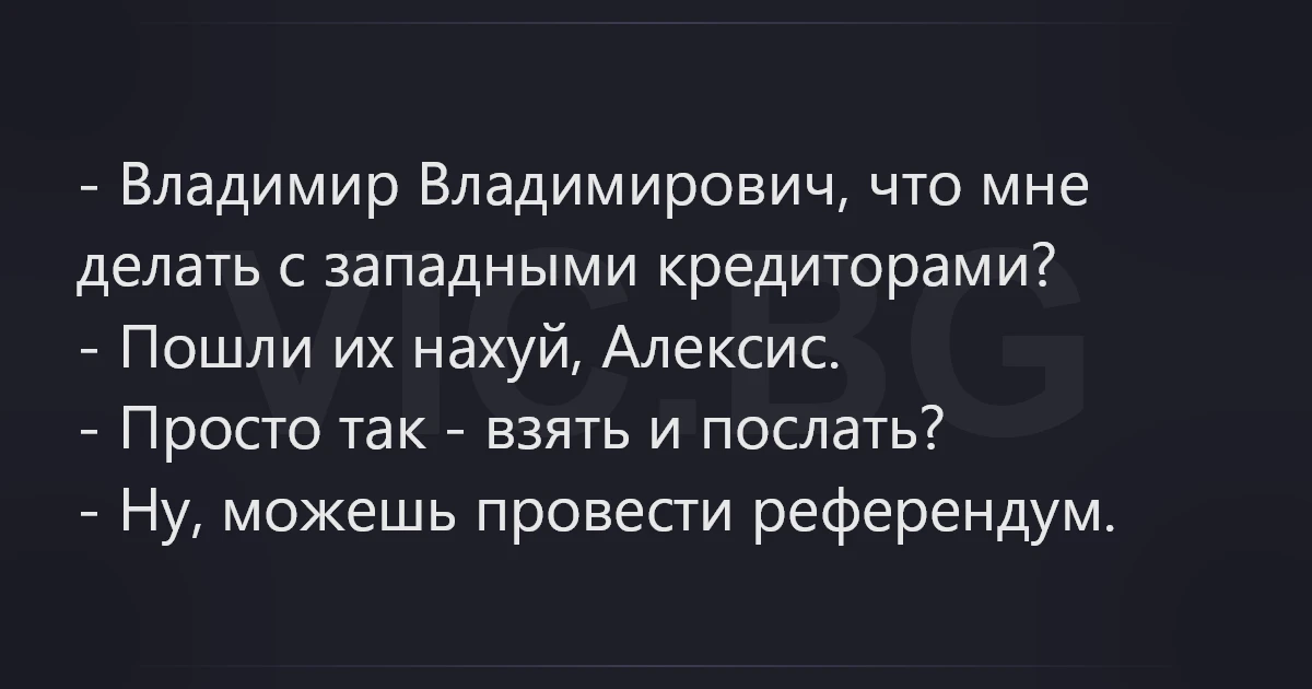 - Владимир Владимирович, что мне делать с западными кредиторами? - Пошли их нахуй, Алексис. - Просто так - взять и послать? - Ну, можешь провести референдум.