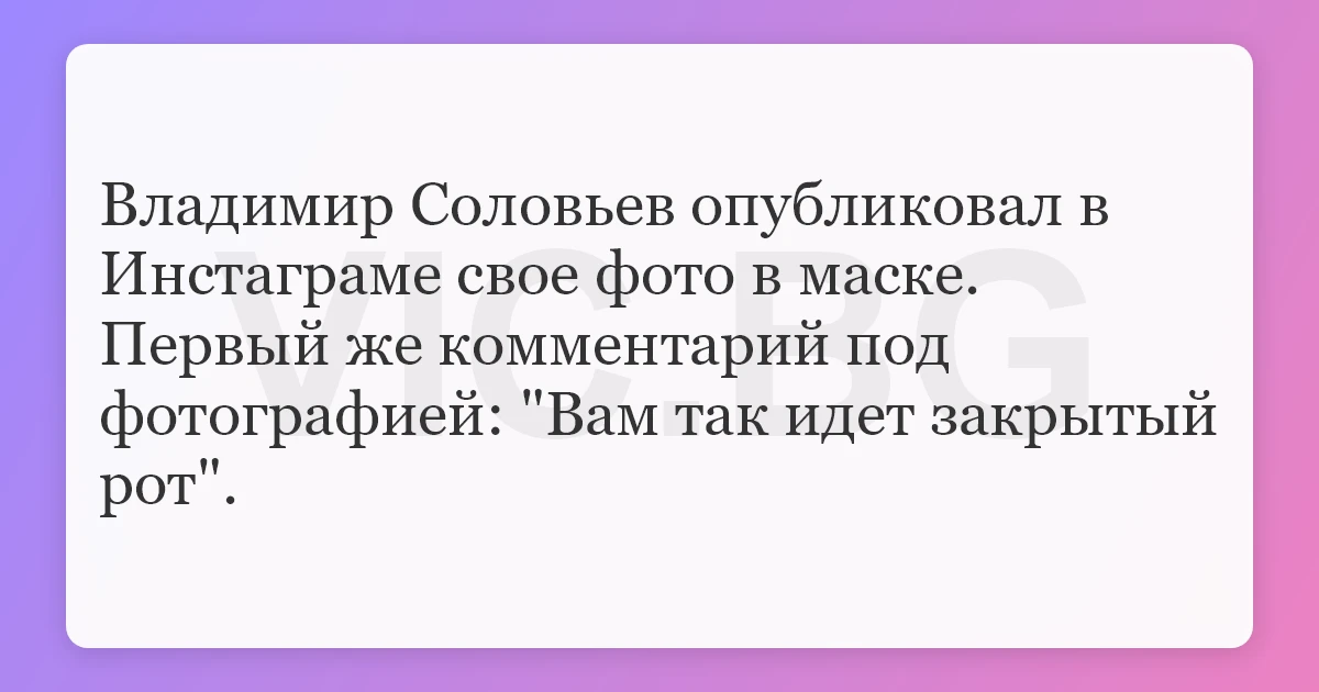 Владимир Соловьев опубликовал в Инстаграме свое фото в маске. Первый же комментарий под фотографией: "Вам так идет закрытый рот".