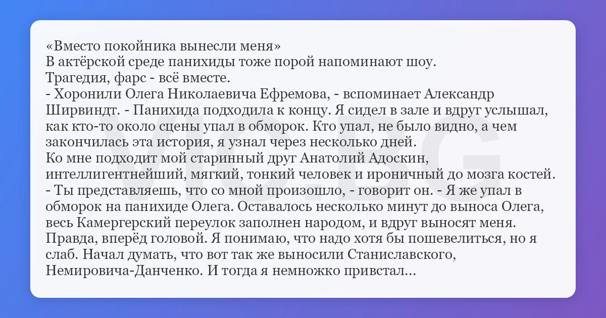 - Ты представляешь, что со мной произошло, - говорит он. - Я же упал в обморок на панихиде Олега. Оставалось несколько минут до выноса Олега, весь Камергерский переулок заполнен народом, и вдруг выносят меня. Правда, вперёд головой. Я понимаю, что надо хотя бы пошевелиться, но я слаб. Начал думать, что вот так же выносили Станиславского, Немировича-Данченко. И тогда я немножко привстал...