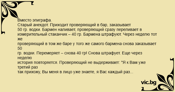 гр. водки. Перемеряет – снова 40 гр! Снова штрафует. Еще через неделю