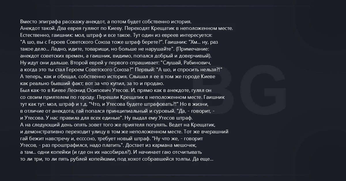 Вместо эпиграфа расскажу анекдот, а потом будет собственно история. Анекдот такой. Два еврея гуляют по Киеву. Переходят Крещатик в неположенном месте. Естественно, гаишник: мол, штраф и все такое. Тут один из евреев интересуется: "А шо, вы с Героев Советского Союза тоже штраф берете?". Гаишник: "Хм... ну, раз такое дело... Ладно, идите, товарищи, но больше не нарушайте". (Примечание: анекдот советских времен, а гаишник, видимо, попался добрый и доверчивый). Ну идут они дальше. Второй еврей у первого спрашивает: "Слушай, Рабинович, а когда это ты стал Героем Советского Союза?" Первый: "А шо, и спросить нельзя?!" А теперь, как и обещал, собственно история. Слышал я ее в том же городе Киеве как реально бывший факт; вот за что купил, за то и продаю. Был как-то в Киеве Леонид Осипович Утесов. И, прямо как в анекдоте, гулял он со своим приятелем по городу. Перешли Крещатик в неположенном месте. Гаишник тут как тут: мол, штраф и т.д. "Что, и Утесова будете штрафовать?!" Но в жизни, в отличие от анекдота, гай попался принципиальный и суровый. "Да, - говорит, - и Утесова. У нас правила для всех единые". Ну выдал ему Утесов штраф. А на следующий день опять зовет того же приятеля погулять. Ведет на Крещатик, и демонстративно переходит улицу в том же неположенном месте. Тот же вчерашний гай бежит навстречу и, ессссно, требует новый штраф. "Ну что же, - говорит Утесов, - раз проштрафился, надо платить". Достает из кармана мешочек, а там... одни копейки (и где он их насобирал?). И начинает гаю отсчитывать то ли три, то ли пять рублей копейками, под хохот собравшейся толпы. Да еще пересчитывает по три раза, да шуточки шутит с прибаутками. В общем, гай, еще не получив штрафа, уже не рад был, что связался... Мораль 1 (для гаев): желая получить с гражданина штраф, подумай, чем это может для тебя кончиться. Мораль 2 (для остальных): бывает, что и уплату штрафа можно превратить в удовольствие. Мораль 3 (для всех): ребята, давайте жить дружно!