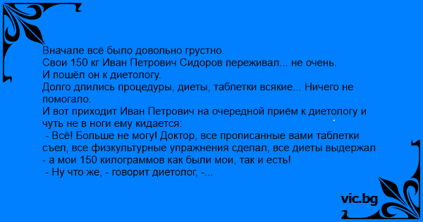 И вот приходит Иван Петрович на очередной приём к диетологу и чуть не в ноги ему кидается: