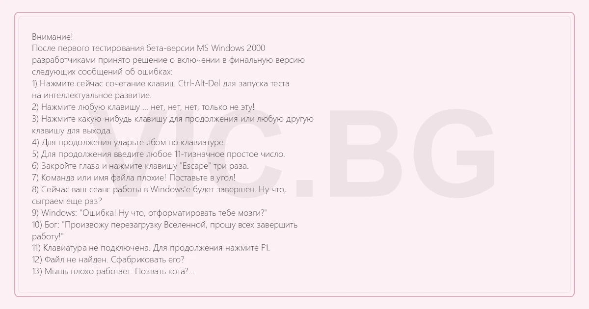 Внимание! После первого тестирования бета-версии MS Windows 2000 разработчиками принято решение о включении в финальную версию следующих сообщений об ошибках: 1) Нажмите сейчас сочетание клавиш Ctrl-Alt-Del для запуска теста на интеллектуальное развитие. 2) Нажмите любую клавишу ... нет, нет, нет, только не эту! 3) Нажмите какую-нибудь клавишу для продолжения или любую другую клавишу для выхода. 4) Для продолжения ударьте лбом по клавиатуре. 5) Для продолжения введите любое 11-тизначное простое число. 6) Закройте глаза и нажмите клавишу "Escape" три раза. 7) Команда или имя файла плохие! Поставьте в угол! 8) Сейчас ваш сеанс работы в Windows'е будет завершен. Ну что, сыграем еще раз? 9) Windows: "Ошибка! Ну что, отформатировать тебе мозги?" 10) Бог: "Произвожу перезагрузку Вселенной, прошу всех завершить работу!" 11) Клавиатура не подключена. Для продолжения нажмите F1. 12) Файл не найден. Сфабриковать его? 13) Мышь плохо работает. Позвать кота? 14) Ошибка выполнения программы 6F по адресу 417A:32CF: некомпетентный пользователь. 15) Ошибка Windows код 547: LPT1 не найден... Использую запасной вариант... КАРАНДАШ И БУМАГУ. 16) Ошибка со стороны пользователя. Замените пользователя. 17) Windows VirusScan 1.0 - "Найдено: OS/2: Удалить? (Да/Да)" 18) Не найден Backup: (В)ыход, (С)топ, (П)u3gец! По мотивам NetDummy (c) Игорь Мостицкий 1999