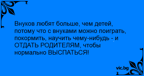 Внуков любят больше, чем детей, потому что с внуками можно поиграть, покормить, научить чему-нибудь - и ОТДАТЬ РОДИТЕЛЯМ, чтобы нормально ВЫСПАТЬСЯ!