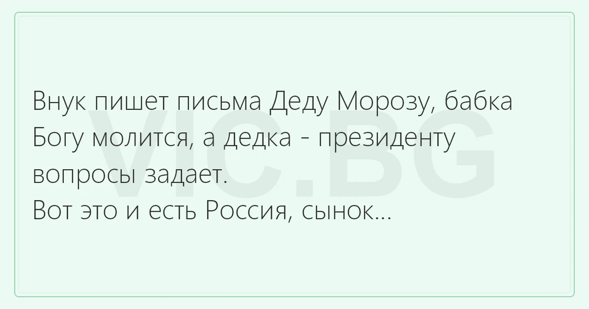 Внук пишет письма Деду Морозу, бабка Богу молится, а дедка - президенту вопросы задает.