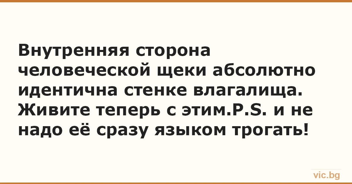 Внутренняя сторона человеческой щеки абсолютно идентична стенке влагалища.<br />Живите теперь с этим.P.S. и не надо её сразу языком трогать!