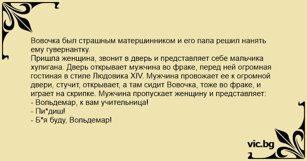 Пришла женщина, звонит в дверь и представляет себе мальчика хулигана. Дверь открывает мужчина во фраке, перед ней огромная гостиная в стиле Людовика ХIV. Мужчина провожает ее к огромной двери, стучит, открывает, а там сидит Вовочка, тоже во фраке, и играет на скрипке. Мужчина пропускает женщину и представляет: