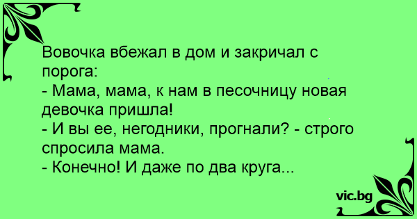 - Мама, мама, к нам в песочницу новая девочка пришла!