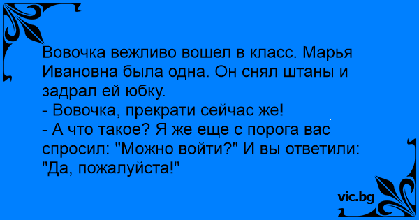 Вовочка вежливо вошел в класс. Марья Ивановна была одна. Он снял штаны и задрал ей юбку.