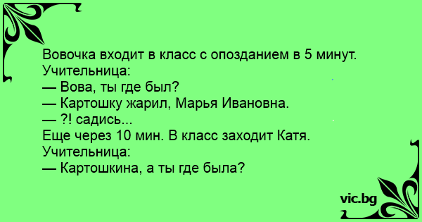 Вовочка входит в класс с опозданием в 5 минут. Учительница: