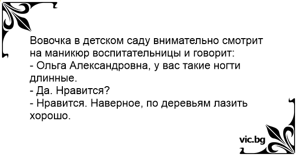 Вовочка в детском саду внимательно смотрит на маникюр воспитательницы и говорит: