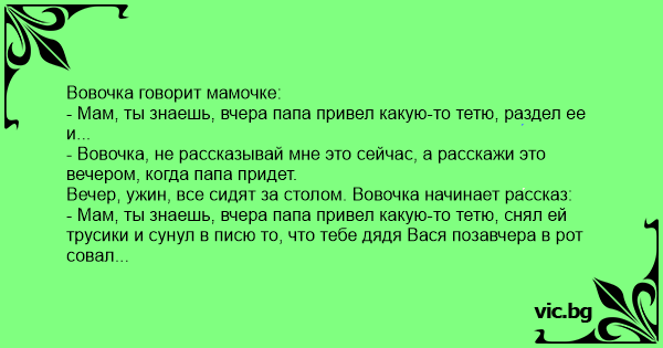 - Мам, ты знаешь, вчера папа привел какую-то тетю, снял ей трусики и сунул в писю то, что тебе дядя Вася позавчера в рот совал...