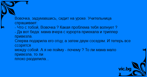 - Да вот беда: мама вчера с курорта приехала и триппер привезла.