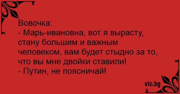 - Марь-ивановна, вот я вырасту, стану большим и важным человеком, вам будет стыдно за то, что вы мне двойки ставили!