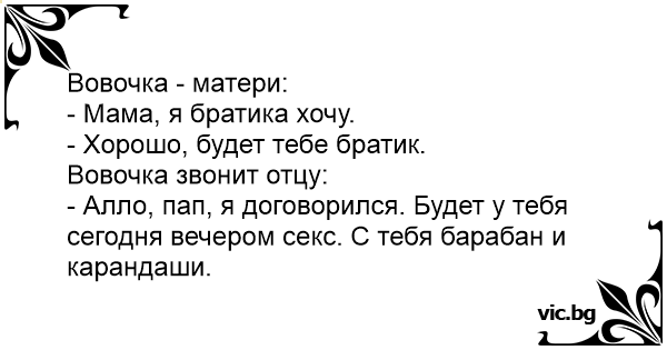Вовочка каже до мами: — Ма, я братика хочу. — Добре, буде тобі братик. Вовочка телефонує батькові: — Ало, тату, я домовився. Буде в тебе сьогодні ввечері секс. З тебе барабан і олівці.