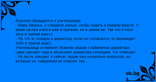 - Марь Иванна, я слишком умный, чтобы сидеть в первом классе. У меня сестра учится уже в третьем, но я умнее ее. Так что я тоже хочу в третий класс!