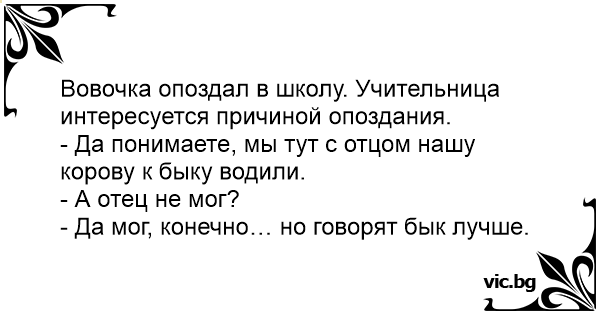 Домашно Hay que llevar a la vaca con el toro Иванчо, защо вчера не беше на училище? В класната стая: Joãozinho chegou esbaforido e todo sujo, além de atrasado, na primeira aula. A professora se indignou: — Isso é hora? E sujo desse jeito? Isso não tem explicação! — Tem sim, professora: tive que levar a vaca lá de casa pro touro cobrir. — Mas o seu pai não pode fazer isso? — Poder, pode, mas acho... C'est un mec qui se promène à la campagne, lorsqu'il croise une toute petite fille de 6 ans qui conduit une vache au bout d'une corde. Le mec lui dit: - Ben ou tu vas comme ça avec ta vache? - Je... Padre recém chegado na paroquia do interior encontra na estrada uma menina de uns seis anos, puxando uma vaca. - Onde vai, minha menina? - Vou levar a vaca para cruzar com o touro do Seu Zé. O... Little Johnny walks a cow through the village square. The mayor sees him and asks, "Hey Johnny, where are you going with the cow?" "I'm taking her to the bulls so she would get impregnated,"... Ögretmen sinifa geç gelen ögrenciye: -neden geç geldin oglum der -bizim inegi damizlik bogaya götürdüm hocam. der çocuk -o isi baban yapamazmiy di? diye sorunca ögretmen, çocuk gülerek -belki... Jantje komt te laat op school en zegt: "Ik moest de stier wegbrengen om een koe te dekken." Onderwijzer, geirriteerd: "Kan je vader dat niet doen?" Jantje: "Zeker, maar de stier kan het beter." Certo dia na roça, o pai mandou seu filho levar o boi para a vila mais próxima para cruzá-lo com uma vaca. No meio do caminho, o menino encontra um padre. O padre, vendo o menininho tão pequeno... Сільська школа: — Петре! Ти чому вчора в школі не був? — Та ми з батьком корову до бика водили. — А що, батько сам не міг? — Та міг, але бик краще. Трпе зошто не дојде вчера на школо? - Морав да ја носам кравата кај бикот. - Зарем татко ти не можеше тоа да го направи? - Па можеше, али сепак бикот подобро ќе ја заврши работата.