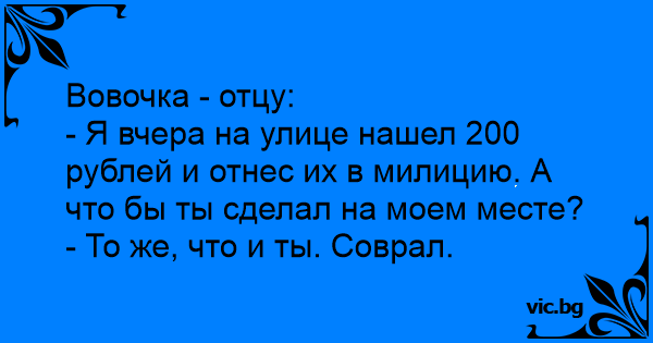 - Я вчера на улице нашел 200 рублей и отнес их в милицию. А что бы ты сделал на моем месте?