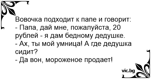 - Папа, дай мне, пожалуйста, 20 рублей - я дам бедному дедушке.
