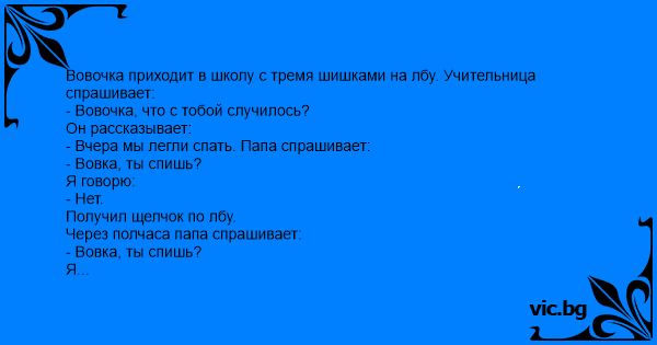 Вовочка приходит в школу с тремя шишками на лбу. Учительница спрашивает: