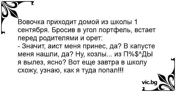 - Значит, аист меня принес, да? В капусте меня нашли, да? Ну, козлы... из П%$^ДЫ я вылез, ясно? Вот еще завтра в школу схожу, узнаю, как я туда попал!!!
