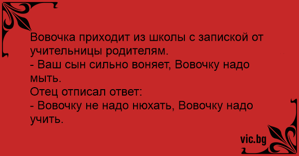 Učitelka napsala žákovi do žákovské knížky: „Smrdí, umývat!” Otec odepsal: „Učit, nečuchat!”