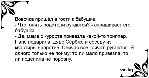 - Да, мама с курорта привезла какой-то триппер. Папе подарила, дяде Серёже и соседу из квартиры напротив. Сейчас все кричат, ругаются. Я одного только не пойму: то ли мало привезла, то ли поделила не поровну.