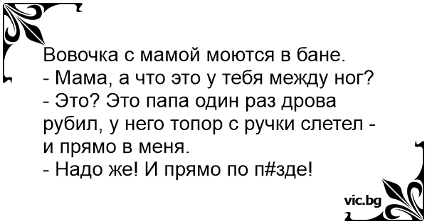 Вовочка с мамой моются в бане.<br />- Мама, а что это у тебя между ног?<br />- Это? Это папа один раз дрова рубил, у него топор с ручки слетел - и прямо в меня.<br />- Надо же! И прямо по п#зде!