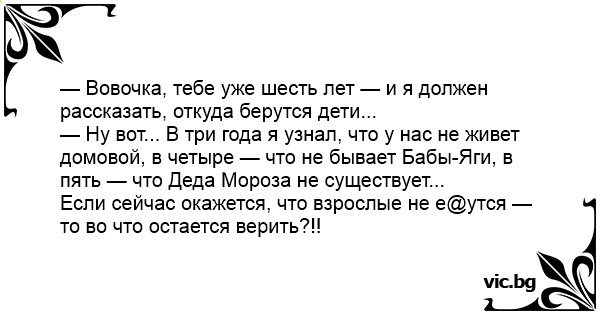 — Ну вот... В три года я узнал, что у нас не живет домовой, в четыре — что не бывает Бабы-Яги, в пять — что Деда Мороза не существует...