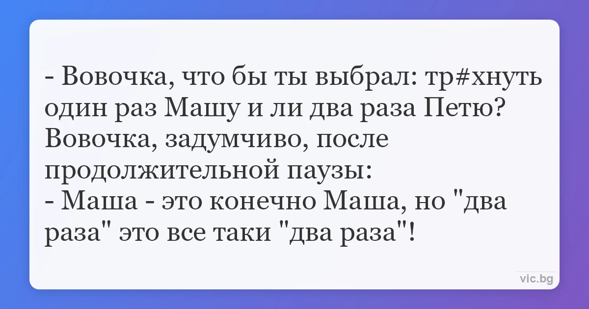 - Вовочка, что бы ты выбрал: тр#хнуть один раз Машу и ли два раза Петю?