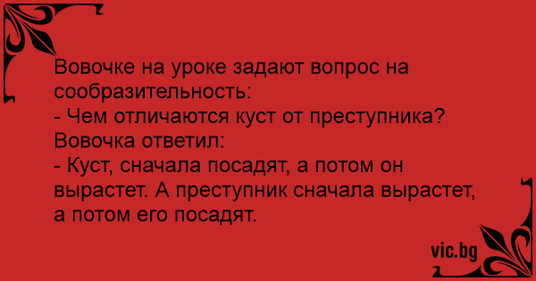 - Куст, сначала посадят, а потом он вырастет. А преступник сначала вырастет, а потом его посадят.