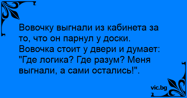 Вовочка идет по коридору школы и говорит: - Не вижу логики, нет я совершенно не вижу логики. Как это, нет логики тут нет. На встречу директор: - Вовочка что случилось. Вовочка: - Я нап%рдел в классе, меня выгнали, они остались нюхать, не вижу логики.