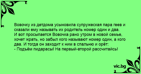 Вовочку из детдома усыновила супружеская пара геев и сказали ему называть их родитель номер один и два.